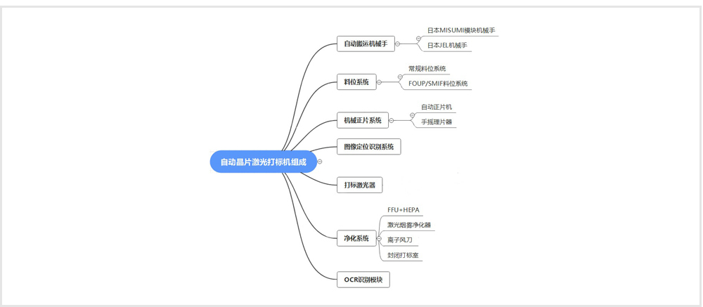 通過機(jī)械手搬運(yùn)晶片,用特定激光器在晶片指定位置打標(biāo),實(shí)現(xiàn)對晶片的自動標(biāo)記??蓪?shí)現(xiàn)軟打標(biāo)和硬打標(biāo)??纱驑?biāo)半導(dǎo)體材料覆蓋:、Si、SiC、GaAs、InP、Al2O3(藍(lán)寶石)、Ge等材料。